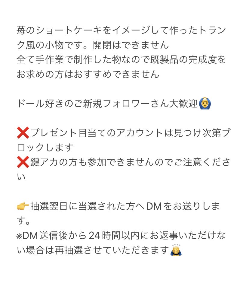 🍓プレゼント企画🍓 MDDサイズ/苺のおうちトランク 1個 ◆参加方法◆ 今から5月18日(23:59)の間にこのツイートをRTしくれたフォロワーさんに抽選で1名様にプレゼントします! 必ず画像の詳細をご確認のうえご参加ください(*ᴗ͈ˬᴗ͈)⁾⁾⁾ #ドルフィードリーム #RE_VANILLA