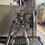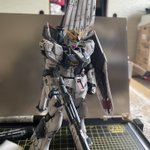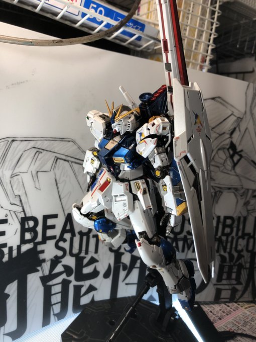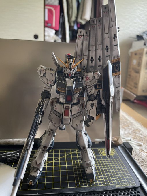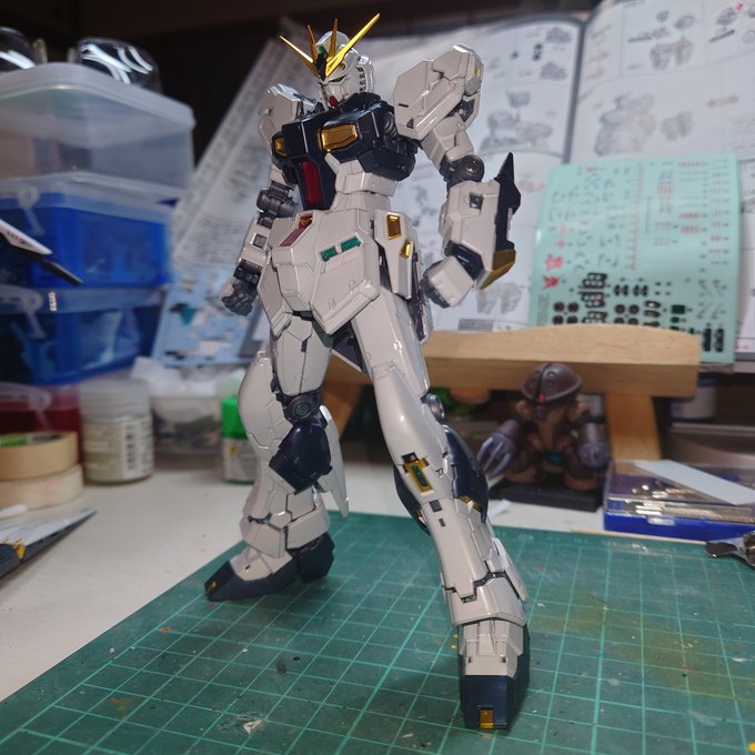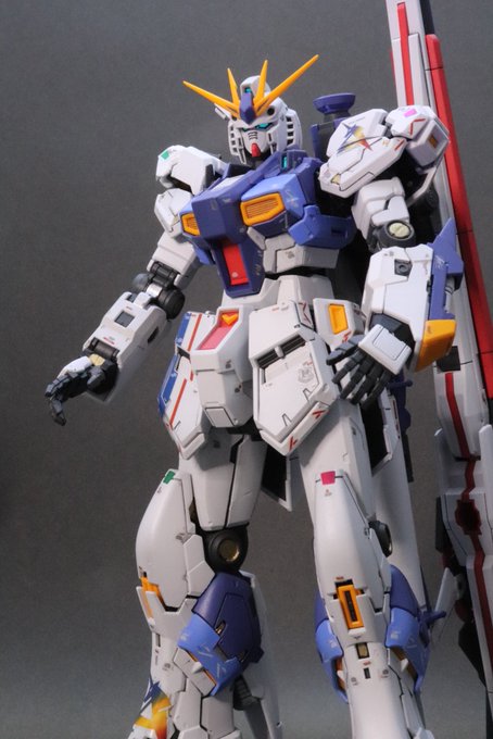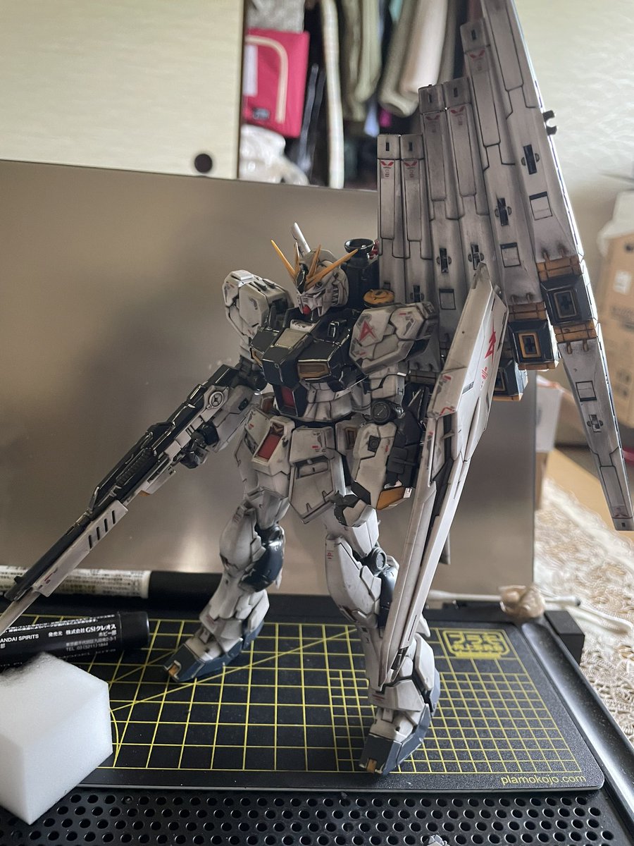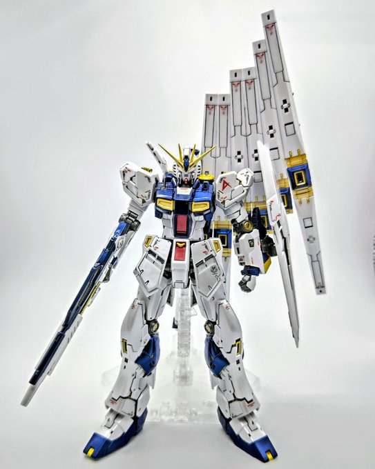 RGνガンダム完成!本当はもう少しマーキング増やした方がいいんだろうけど…今回はシルバーによる塗装剥げ表現を追加してるためその部分に影響の出ないところだけに留めました。#ガンプラの画像を貼るとRTされると聞いて #RGνガンダム