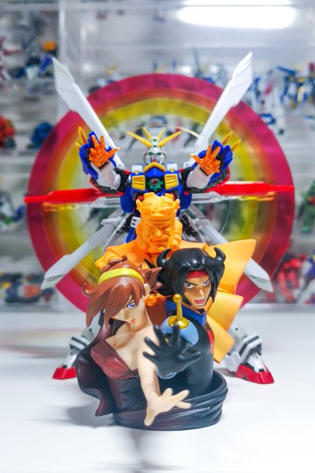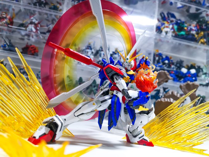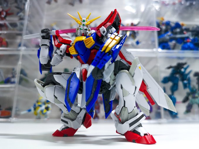 RGゴッドガンダム完成しました! ディテール掘り直しを行い最低限のディティールアップを行いRGの造形を生かせるような塗装を意識しました。 2期OPで印象的な腕組ポーズを再現するためにコーナーポストを3Dプリンタで自作しました(1/2) #RGゴッドガンダム #ガンプラ