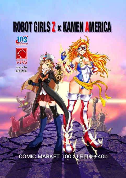 ポスターできました! コミックマーケット100 『仮面アメリカ合同誌』 8/13土曜東チ40bケモノイド委託参加 観に来てね! #ロボットガールズZ #RGZ #KamenAmerica #C100