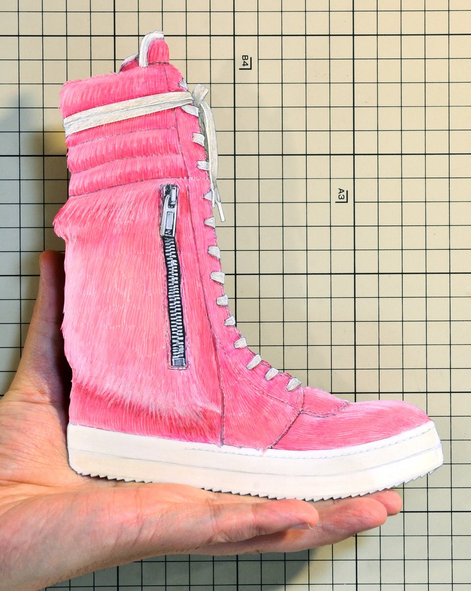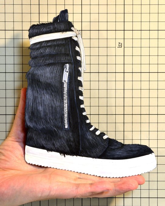 【今日の靴】02079足目 “Rick Owens” Cargo Basket Faux Fur and Leather High-Top Sneaker #RICKOWENS #sneakers #illustration #copic #copicmarkers #スニーカー #切り絵 #イラスト #コピック