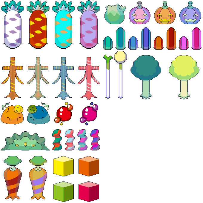 美術館の展示作品に触発されてこんなものを作っています✨(海要素も混ざってますが) 野菜のほうは今日はブロッコリーしか描いていません🥦 #rpgツクールMV #pixelart #ドット絵 #絵描きさんとつながりたい