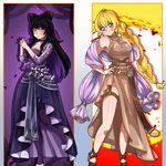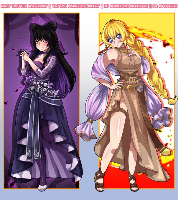 Blake and Yang in the dresses of #rwbyicequeendom @GraffartC. I loved these outfits so much! #blakebelladonna #YangXiaoLong #bumbleby #bmblby #rwbyiq For more #RWBYfanart you can follow or see my pinned tweet to c0mmission your favorite, thank you! #RWBY