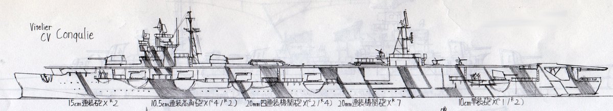 #架空艦 #イラスト #R_o_Vitelier 名称 Conqulie(コンキリ) 航空母艦 主砲 15cm連装砲 2基 副砲 10cm単装砲 3基(左1右2) 対空 10.5cm連装高角砲 6基(左2右4) 機砲 20mm連装機関砲 7基(右舷側のみ)