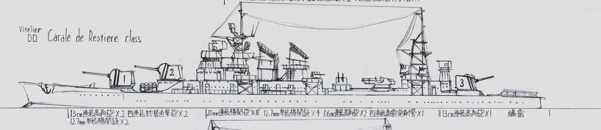 #架空艦 #イラスト #R_o_Vitelier 名称 Carale de Restiere(カラーレ デ レスティエーレ)級 駆逐艦 主砲 13cm連装高角砲 3基 対空 7.6cm連装高角砲 2基 機砲 20mm連装機関砲 8基 機銃 12.7mm単装機関銃 6基 水雷 四連装魚雷発射管 1基 対潜 四連装対潜迫撃砲 2基 対潜 爆雷