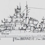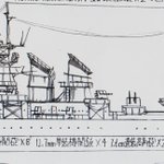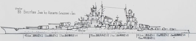 #架空艦 #イラスト #R_o_Vitelier 名称 Brestforo Jua ko Karanto Grazzoni(ブレストフォロ ユア コ カラント グラッツォーニ)級 戦艦 所属 ヴィテーリェ共和国海軍[RoVN] 塗装 白 艦固有番号 - 主砲 40.6cm三連装砲 3基 副砲 13cm連装砲 2基 副砲 10cm単装砲 2基 →
