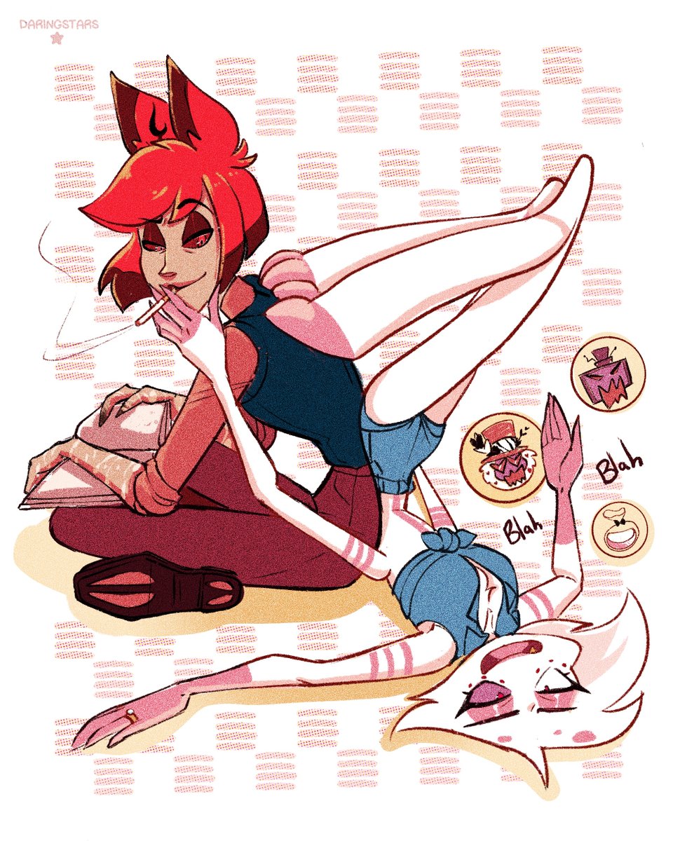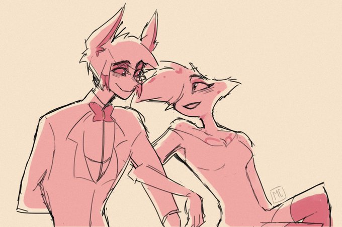 The piece I did for the @RadiodustVIP zine- I'm so soft for seeing them in casual intimacy 💖 I sort of ended up getting inspired with a sort of 70's vibe but the bird app hates the noise. Thank you for including me! #Radiodust #hazbinhotel #hazbinhotelfanart