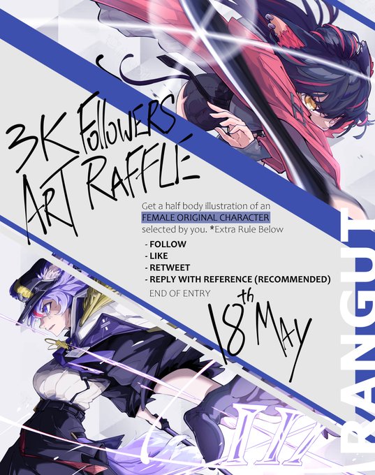 Thank you for the follows 🐰3000 FOLLOWERS ART RAFFLE Half-body illustration of a FEMALE ORIGINAL CHARACTER selected by you - Follow - Like - Retweet - Reply with reference (recommended) - Extra Rule Below ENTRY ENDS AT 18th May 2023 #Giveaway #raffle #artraffle #digitalart