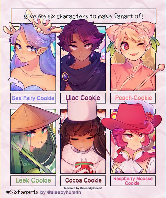 hice otro #SixFanarts, pero esta vez con personajes de #CookieRun 🍪✨ : #digitalart #seafairycookie #lilaccookie #peachcookie #leekcookie #cocoacookie #raspberrymoussecookie