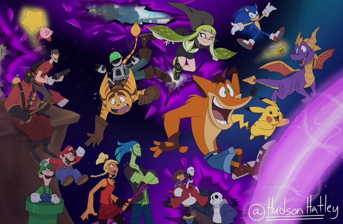 It's finally HERE!!! All of my favorite game franchises in one drawing!! Months of work finally paid off!😊💕💕💕!!!! #CrashBandicoot #Pokemon #SonicTheHedgehog #Splatoon2 #TF2 #SuperMario #undertale #NoStraightRoads #SpyroTheDragon #RatchetPS5 #Kirby