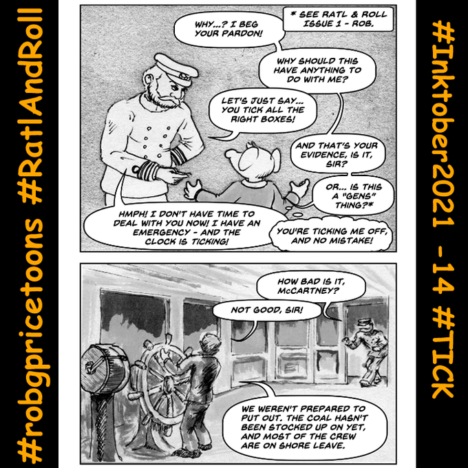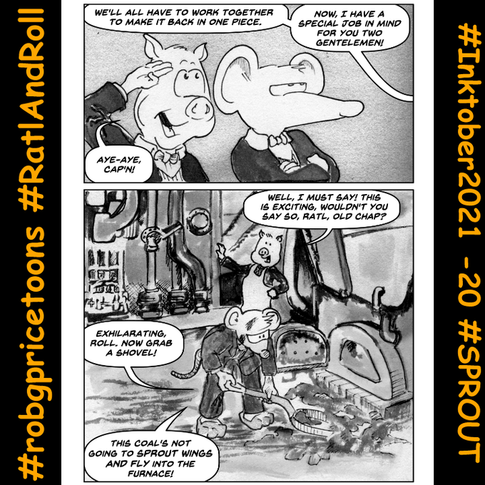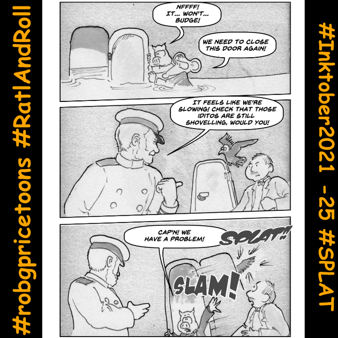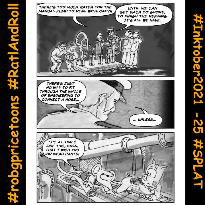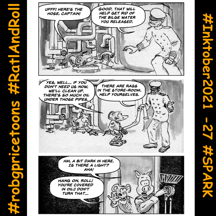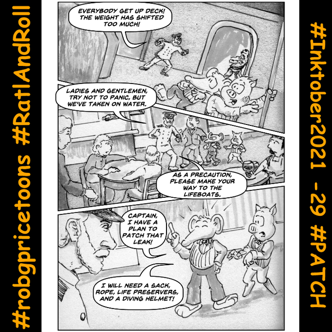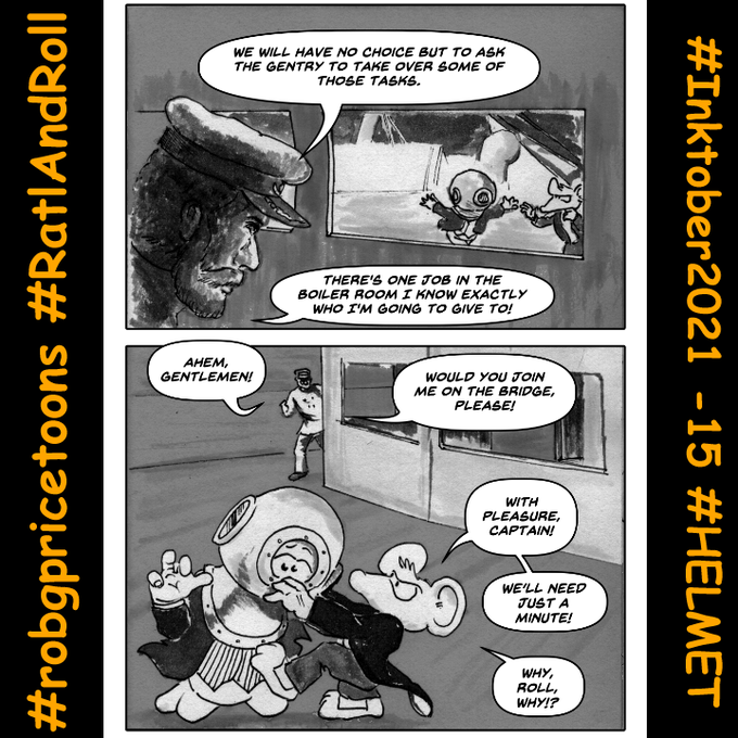 Tuesday to Friday are my busy days - but I'm glad I could sneak in page 26 of my #RatlAndRoll #inktober2021 - only four more days to go! I think I can... I think I can... #comicstrip #comic #comicbookart #indiecomics #bandedessinee #worldbuilding #steamship #connect #comicsart