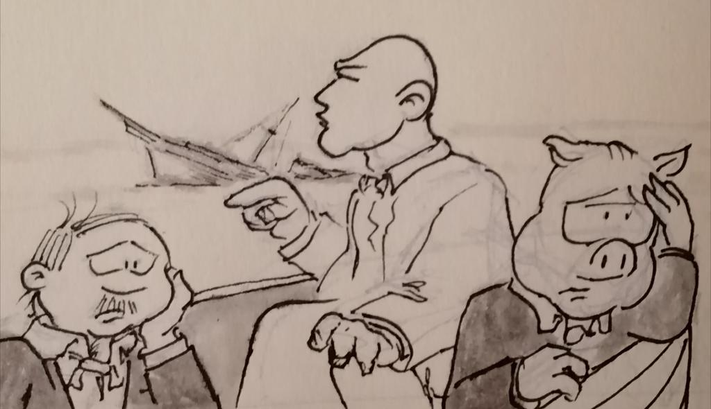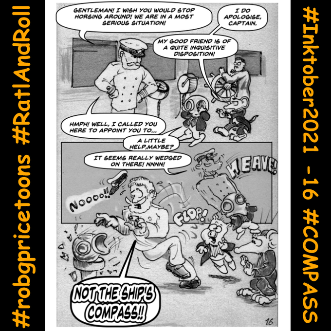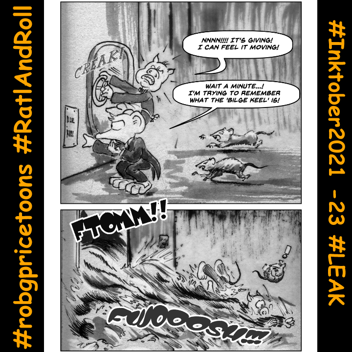 Our chaps are back in the Captain's good books? Sure, they're getting on like a house on... Oh, dear! #spark #inktober2021 #RatlAndRoll #comics #comic #characterart #comicbooks #comicart #clipstudiopaint #comicbook #cartoons #webcomic #cartoonist #comicartist #inkwash #brushpens