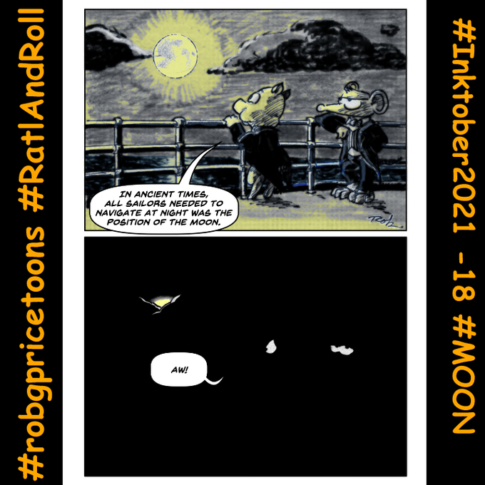 Wow, 18th already! #Roll on the next 13 (You see what I did there?) 💯🙏to my retweeters yesterday - and to @thegraphicgoose (my new marketing manager 🤪) #RatlAndRoll #Inktober #inktober2021 #moon #comics #characterart #comicart #comicbook #cartoons #webcomic #comicartist #ink