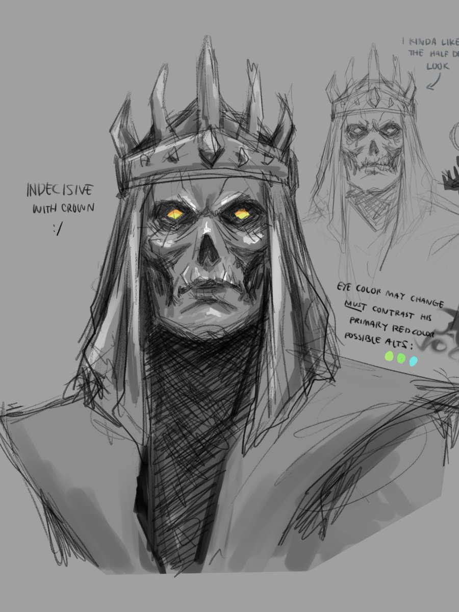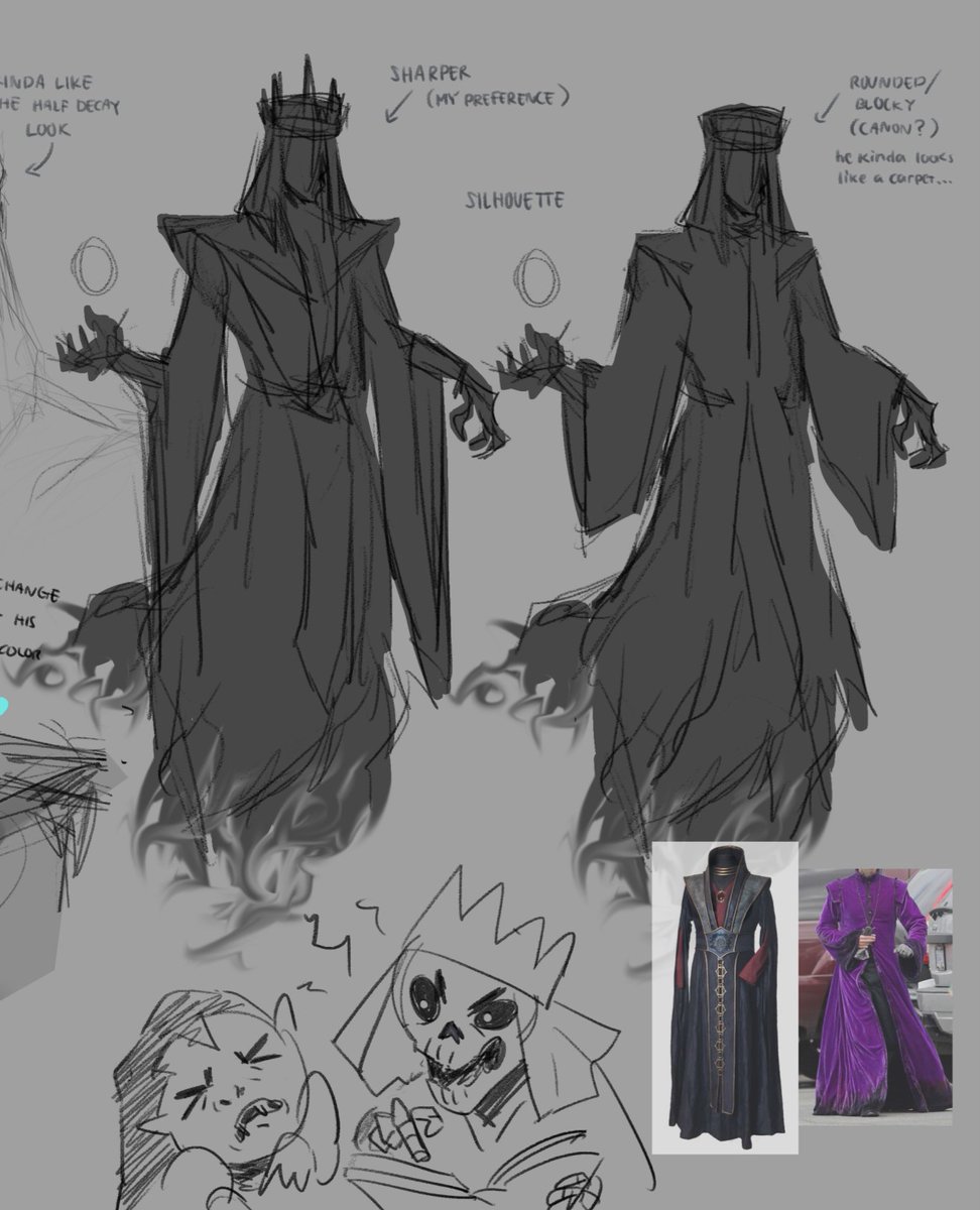 old concept sketches for Azalin Rex bc I havent wrapped my head around a design Im satisfied with drawing him in-- ,, (this was mostly for zine purposes) last doodle is the only important thing in this sketch page #Ravenloft #dndart #doodle ☠🔮👑
