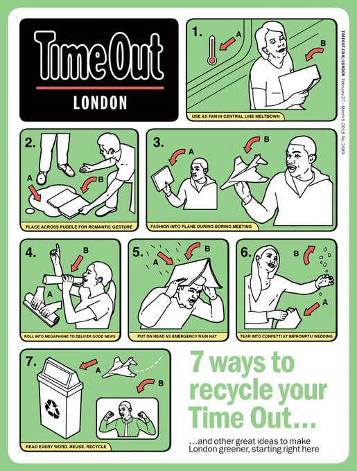 Step-by-step graphic illustration guide of ways to recycle various objects for #TimeOutLondon by #SonofAlan, represented by @folioart Explore more: buff.ly/3tMCqvP #LeadwithSustainability #sustainability #recycle #green #informationgraphic #illustrationguide #humor