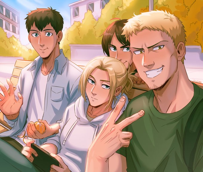 Break time ! (ft. one sneaky photobomber) #chalseu #snk #bertholdthoover #annieleonhart #erenjaeger #reinerbraun