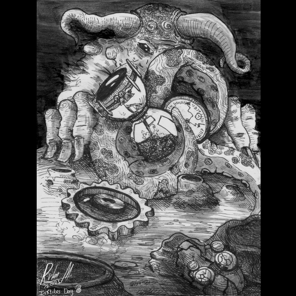 Día 8: #watch #reloj El tiempo es esa fuerza que nos come a todos (como Cronos comiéndose a sus hijos) así que hay que sacarle jugo y no desperdiciarlo, nota: la numeración está en maya #Inktober #inktober2021 #InktoberDesintegrado2021