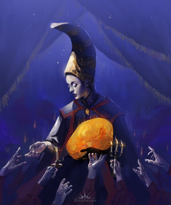 "The young astrologer gazed at the night sky as she walked. (...) Then she met the full moon - and, in time, the astrologer became a queen." Queen Rennala with her children, Ranni, Radhan and Rykard. #eldenring #fromsoftware #Rennala #Ranni #sketchbook #fanart