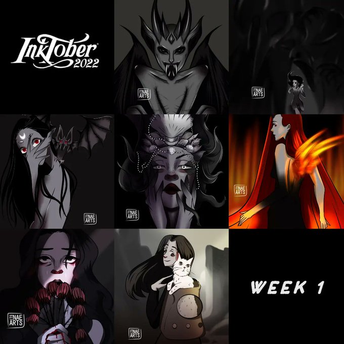 INKTOBER Week 1 ✅ Let's see how week 2 will go! Tell me which one is your fav of week 1 🖤 #Retweet = Support an Artist ♥️ #inktober #inktober2022 #gargoyle #scurry #bat #scallop #flame #bouquet #trip #digitalartwork #digitaldrawing #art #digitalart