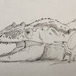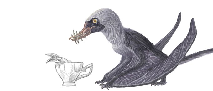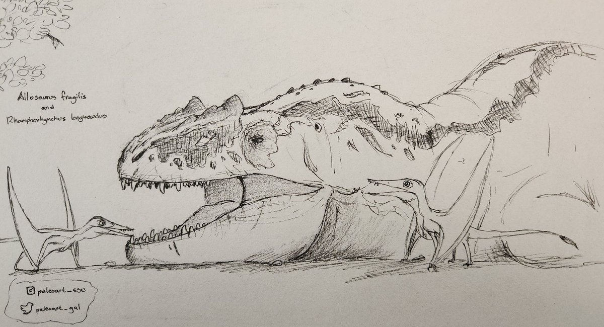 "Strange Lizard & Beak Snout" A sub-adult Allosaurus, having just finished a meal, takes a rest in the company of two Rhamphorhynchus to clean his teeth of any scraps. #paleoart #paleontology #dinosaurs #art #traditionalart #allosaurus #rhamphorhynchus #theropod #pterosaur