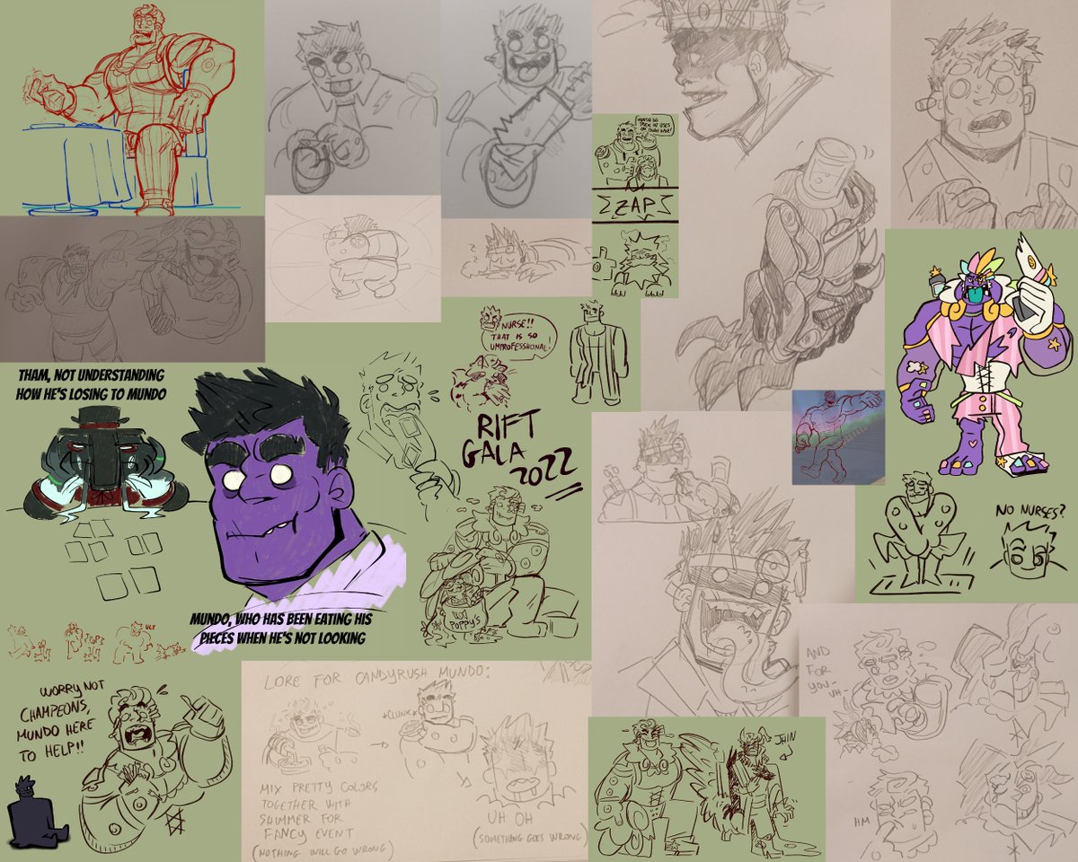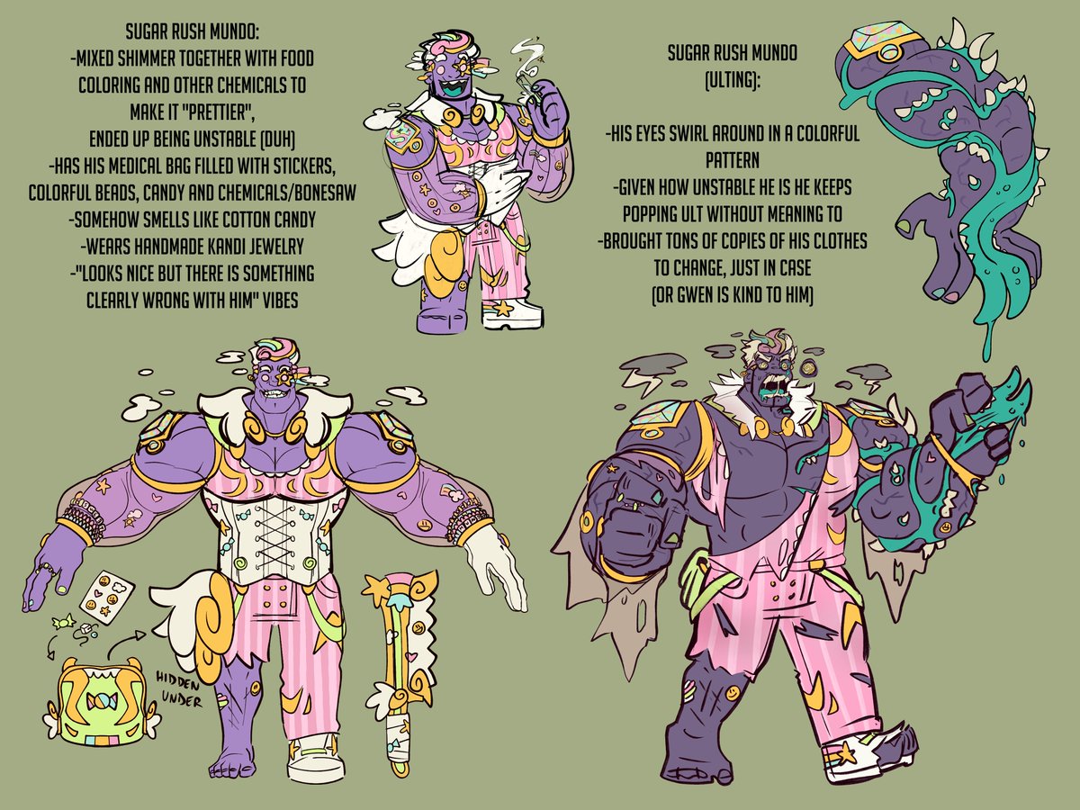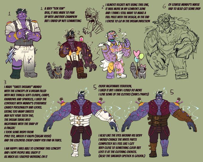 2/2 And here's a two piece thread with all additional compiled artwork made for it! 🍬🍭 -Scrapped designs + notes -Sketch phase -Compilation of Gala server drawings I did -Closeup Thanks for the love and Cheers!!!💜 #drmundo #doctormundo #artoflegends #leagueoflegends #riftgala