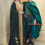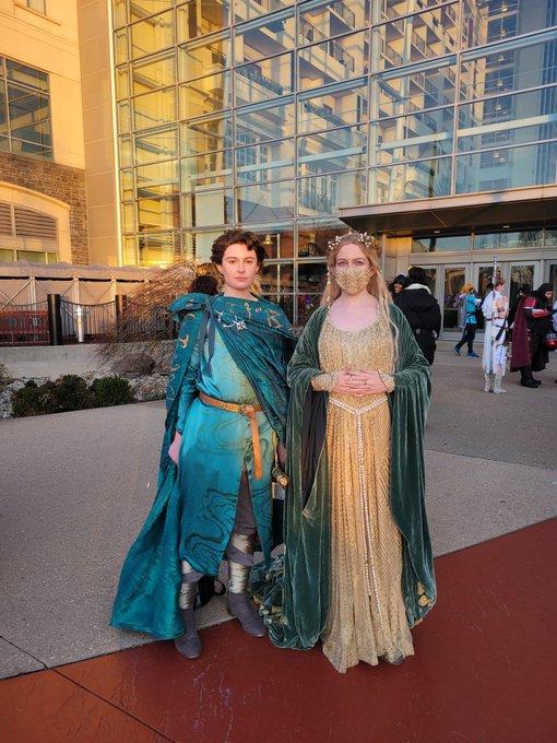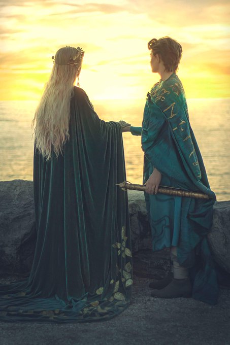 Is there really anything as magical as ✨fabric textures✨? After working on these costumes separately for half a year, bringing them side by side was so gratifying. #cosplay #lordoftherings #ringsofpower #tolkien @LOTRonPrime Elrond: @woodsmokewords Galadriel: me!