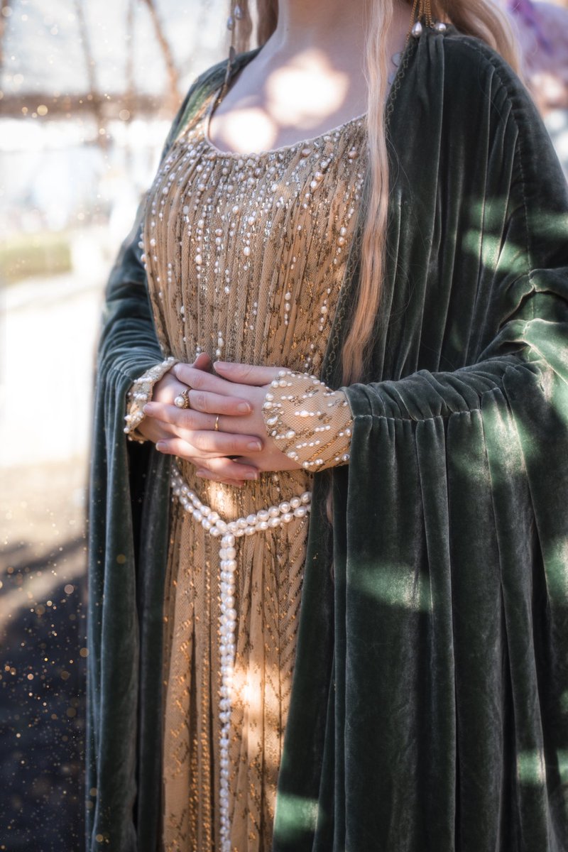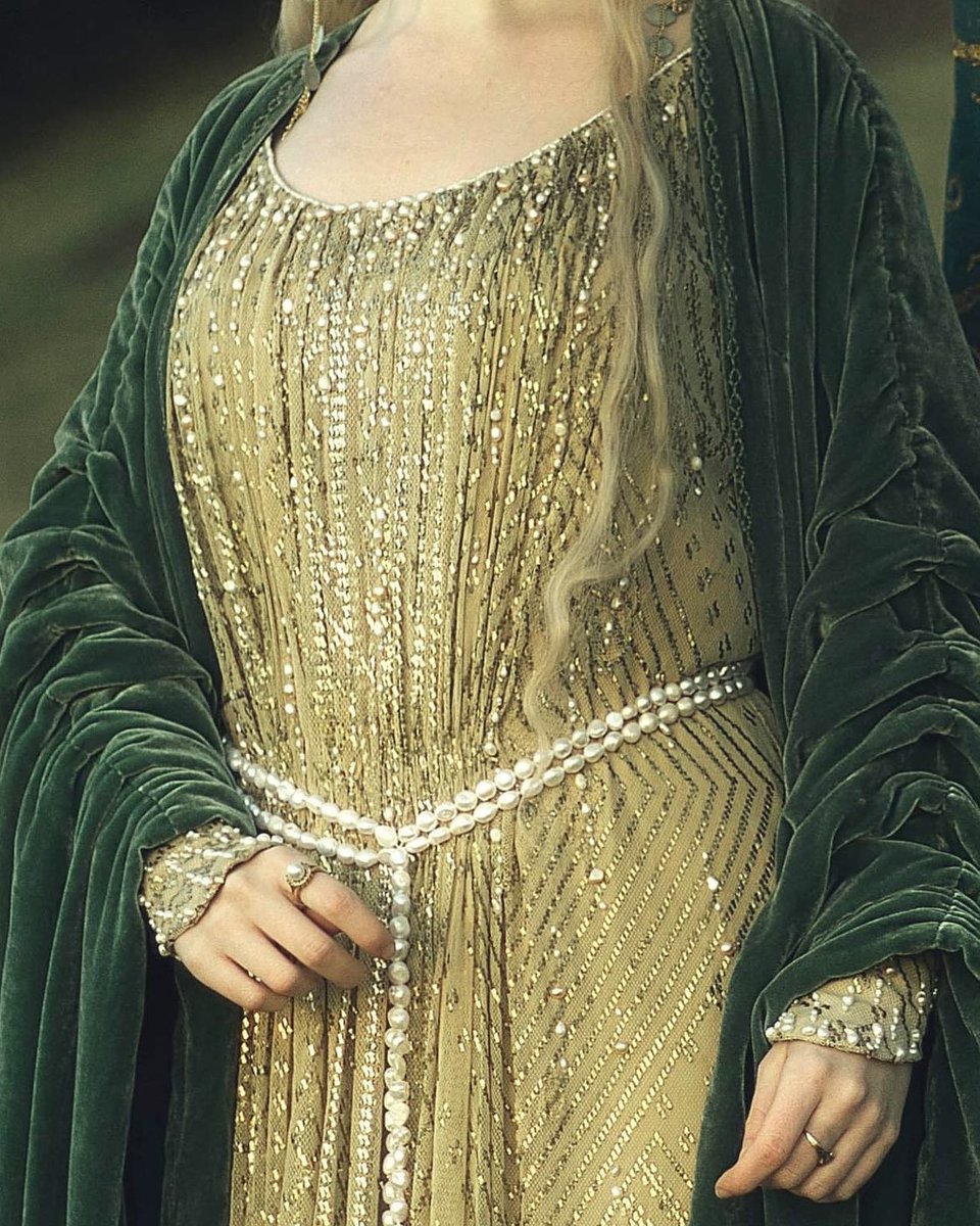 Galadriel DETAILS!! If you weren’t able to fully appreciate the pearls on this costume—now you can! I was so surprised at how well they blended with the metal embroidery of the assuit! #RingsOfPower #tolkien #galadriel #cosplay #lotr Photo by @honeyheather_
