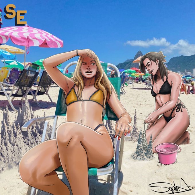 Day 4 of #inktober and our couple is spending an afternoon at the beach! Bianca - gay af - is building a castle for her princess . . #praia #riodejaneiro #webcomics #webtoon #casal #illustration #procreate #drawing #inktober2022 #characterdesign #oc #originalcharacter #wlw #lgbtq