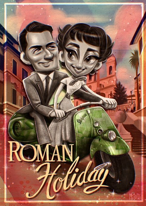 ローマの休日をprocreateで描いてみました🛵背景も乗り物も、もっと練習しよ! #ローマの休日 #カリカチュア #似顔絵 #デジタルイラスト #romanholiday #caricaturejapan #digitalart #procreate #characterdesign