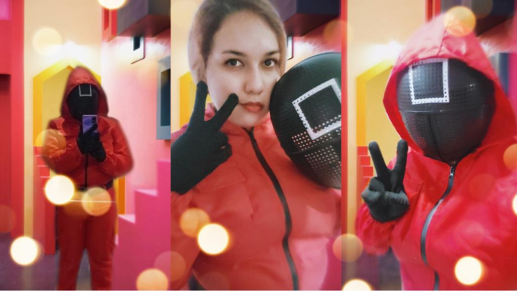 Sou a nova infiltrada 😌 Dei sorte de pegar a máscara de quem é responsável pela supervisão 😏🔳 #SquidGame #Round6 #fabifairy #cosplay #BoaNoite 🧚🏻♀️🇧🇷💜