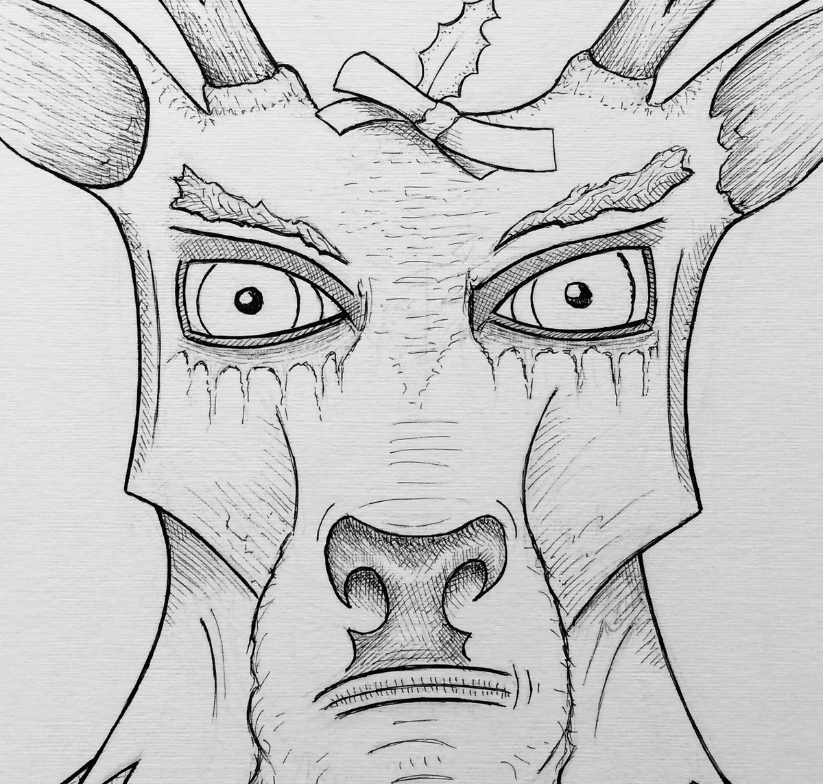 #inktober2022 WIP 16”x12” #illustration , ink on textured canvas paper 📝 ! Bad Rudolph ! outline nearly done ✅, next step is to add some pencil ✏️ on face, red ink on nose and clothe and yellow acrylic ink background , #art #drawing #ink #Inktober #Rudolph