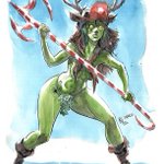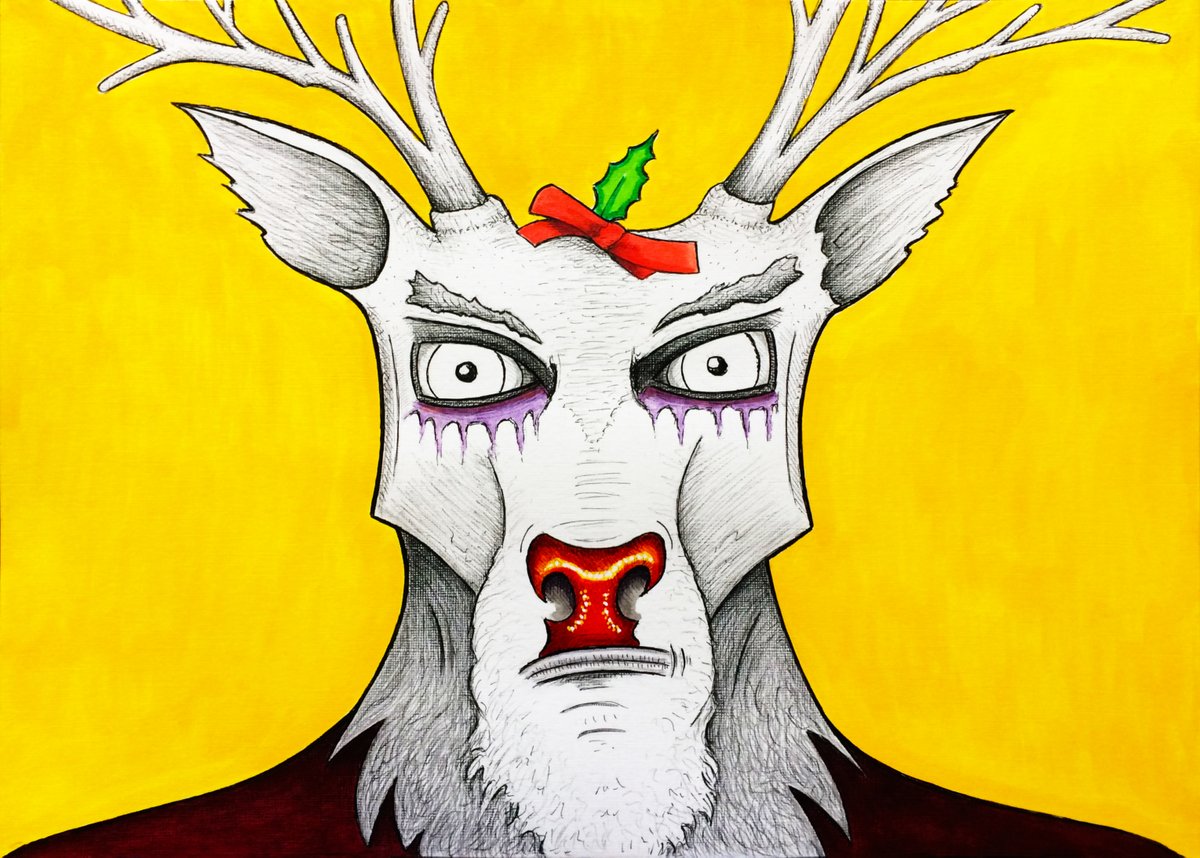 #inktober2022 16”x12” #illustration. Tittle: "Bad Rudolph!"! Ink outlines & ink wash, pencil shading, acrylic ink on the clothes, nose, under eyes, bow and background. On textured Canvas paper #art #drawing #ink #Inktober #Rudolph #nose #Halloween