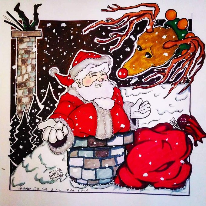 @inktober Day 12 and 13 - Stuck and Roof... Santa Claus Stuck on a Roof... Also, Roronoa Zoro... #inktober #inktober2021 #inktoberday12 #inktoberday13 #stuck #roof #santaclaus #merrychristmas #rudolph #rudolphtherednosedreindeer #roronoazoro #water7 #onepiece #Christmas