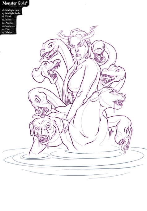 Inktober Day 23 -Water- The sea monster Scylla was a creature with six heads on long snakey necks, while her loins were girdled by the heads of baying dogs. From her lair in a cave she devoured whatever ventured within reach #inktober #inktober2021 #scylla #seamonster #mythology