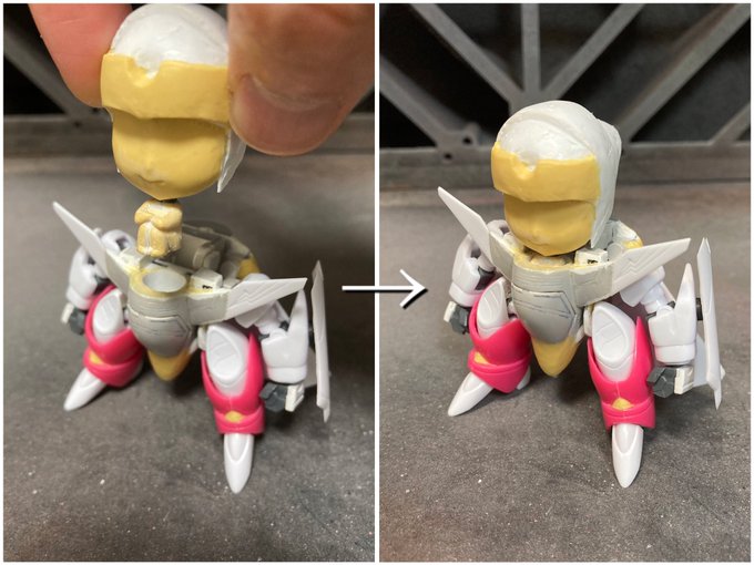 #SDマクロス をミレーヌバルキリーに改造中。 人の顔をしてるので、変形の為に頭を引っこ抜くのが可哀想で、小さい胴体をパテで付けました。 お尻の磁石でバルキリーにヘッドオンします。 #マクロスモデラーズ