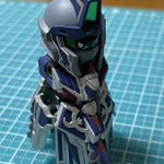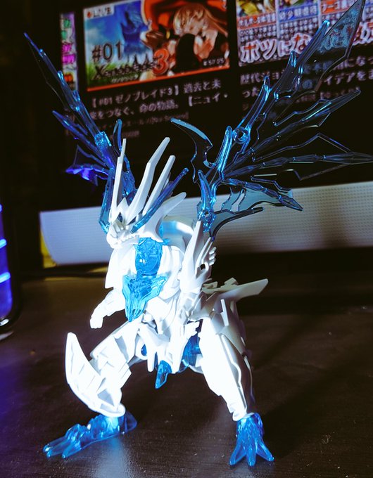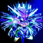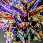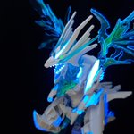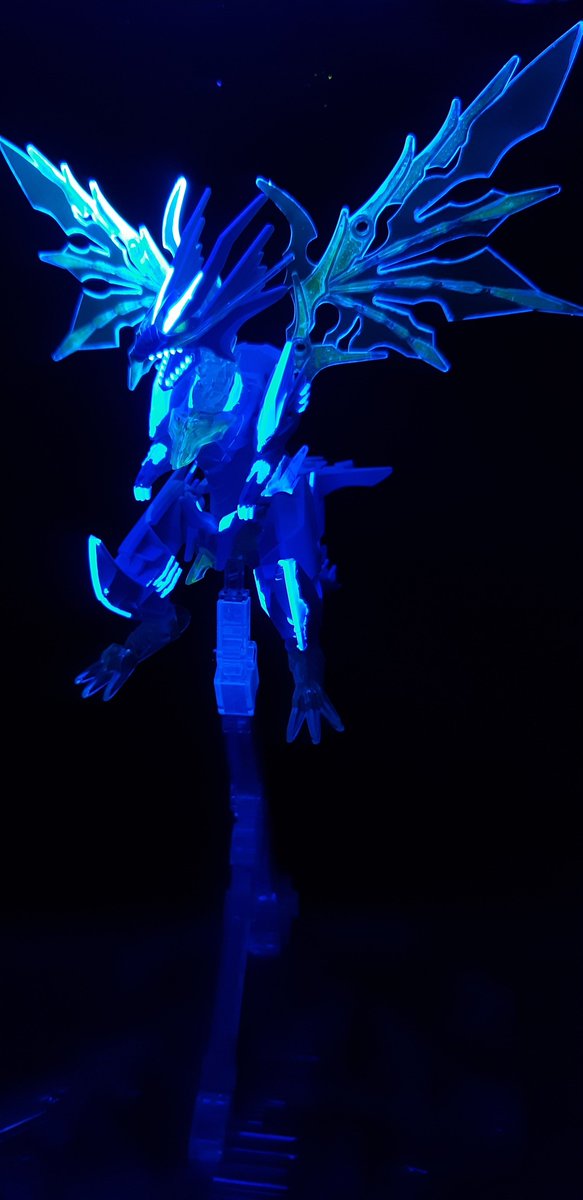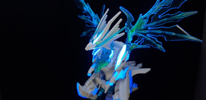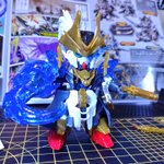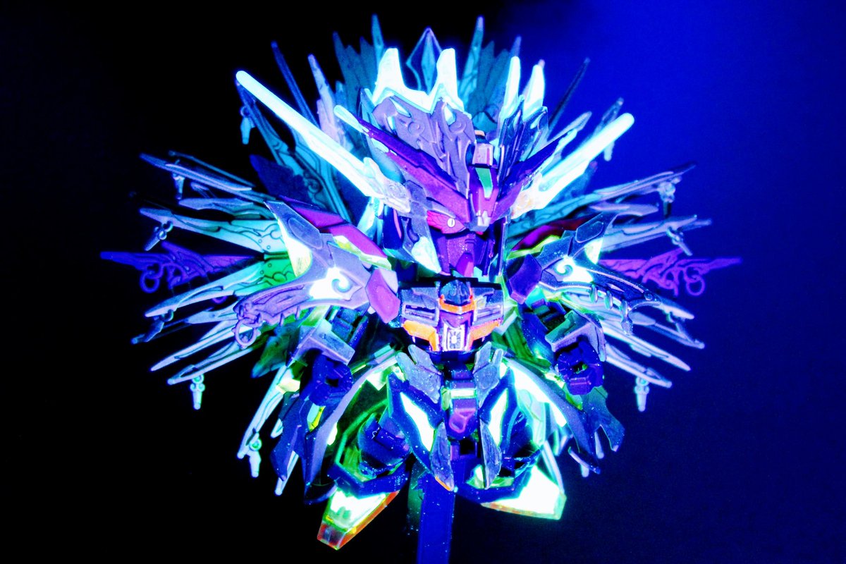 SDW HEROES シャイングラスパードラゴン クリアパーツの羽の肉抜きをレジンで埋めてるツイートを見かけて…ルミノカラー混ぜてみようと思い立った作品がこちら 羽は自然光では青一色ですが、ブラックライトを当てると一部緑に光るようにしました。 #SDWHEROES #ガンプラ #ガンダム