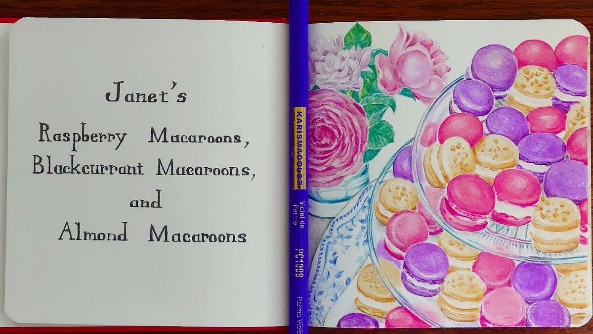 ジャネットのマカロン 🔴ラズベリー 🟣クロスグリ 🟡アーモンド クロスグリのマカロンってとても珍しいですよね😲✨✨酸味がある感じでしょうか? 美味しそうですね〜💕💕 #ブリティッシュベイクオフ #TheGreatBritishBakeOff #season2 #色鉛筆 #イラスト #illustration #マカロン #macaroon