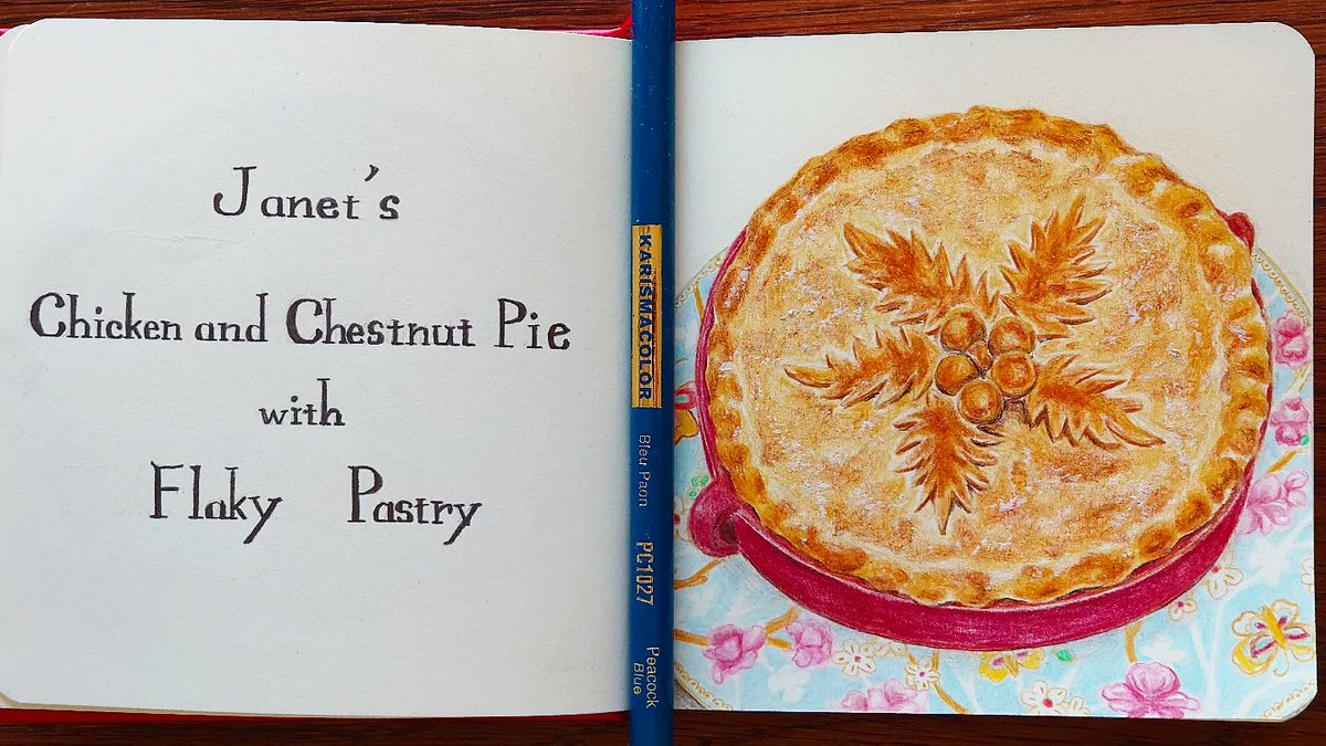 ジャネットの鶏肉、ベーコン、クリのパイ🥧 クリスマスをテーマに作ったと言っていたので、パイの表面の模様がヒイラギの模様になっていました💖🎄🎅 クリスマスももう来月ですね😲🎄🌠 #ブリティッシュベイクオフ #TheGreatBritishBakeOff #season2 #色鉛筆 #イラスト #illustration #pie #パイ