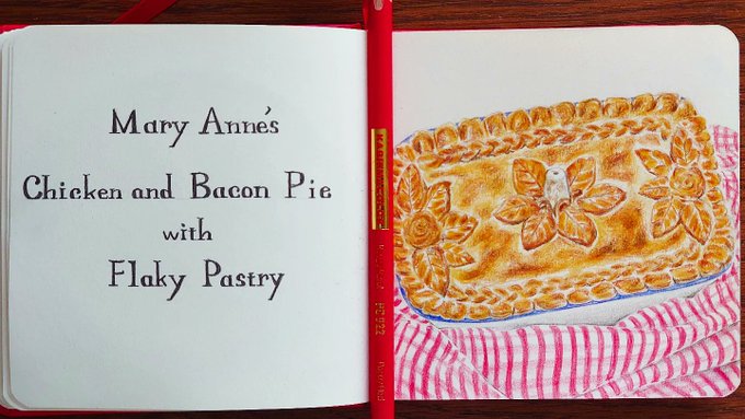 メアリー・アンのチキンとベーコンのパイ🥧 「模様も綺麗だし焼色もいい」 と第一印象は高評価でしたが、 「フィリングは素晴らしいが酢が強すぎる」と生地はイマイチの結果でした😣 #ブリティッシュベイクオフ #TheGreatBritishBakeOff #season2 #色鉛筆 #イラスト #illustration #pie #パイ