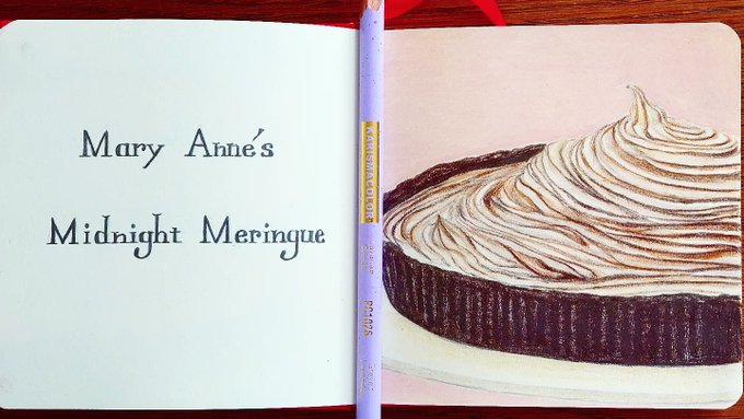 メアリー・アンの「ミッドナイトメレンゲ🌜」 メアリー・アンはチョコレートペイストリーもメレンゲも黒を基調に作っていました✨✨ #ブリティッシュベイクオフ #TheGreatBritishBakeOff #season2 #色鉛筆 #イラスト #illustration #pie #パイ