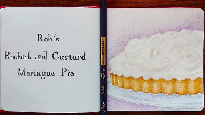 ロブの「ルバーブとカスタードのメレンゲパイ」🥧 時間配分については前々からポールに注意されていたのに、この回でも失敗してしまったのが残念でした😣💦💦 #ブリティッシュベイクオフ #TheGreatBritishBakeOff #season2 #色鉛筆 #イラスト #illustration #pie #パイ