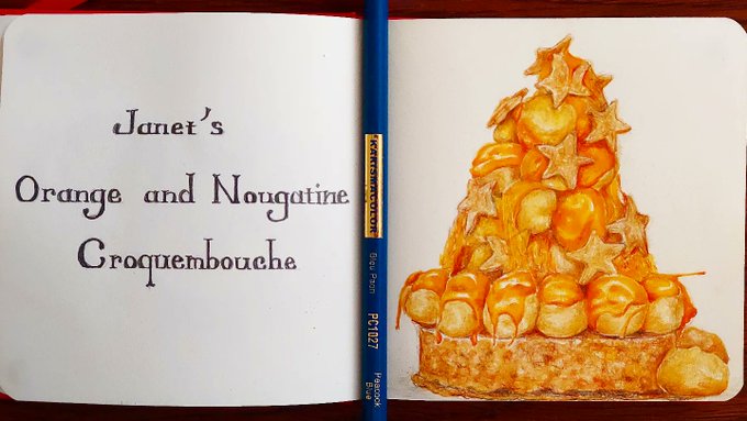 ジャネットの「オレンジとヌガーのクロカンブッシュ🍊」 ショーストッパーチャレンジは【クロカンブッシュ】がテーマです💖 制限時間は5時間🕛 #ブリティッシュベイクオフ #TheGreatBritishBakeOff #season2 #色鉛筆 #イラスト #illustration #cheesecake #クロカンブッシュ #croquembouche