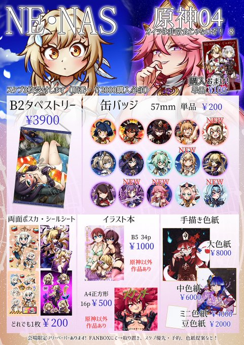 『お品書き』 3月20日のオイラは非常食じゃないぞ! 8(#SHT2022春)に参加します! 🆕新品の原神缶バッジと色紙 ⭐️紙製品の限定版グッズ(シャナの新品を含む) ✏️スケブは3枚まで受付予定 よろしくお願いします~ #SHT2022 #オイラは非常食じゃないぞ #原神イラスト