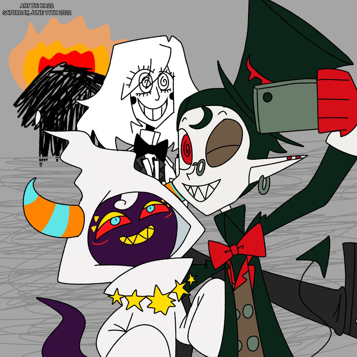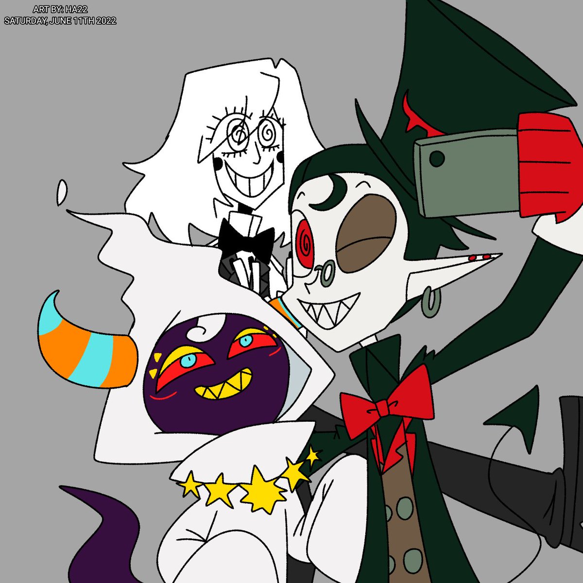 Breaking news! Two local demons and one monochrome evil spirit are commiting arson. #fanart #ghostandpals #thedistortionist #chrisp #snobbism #neru #bizukun #bizu #ようこそ星のお宿 #kikuo #vocaloid #crossover #meme