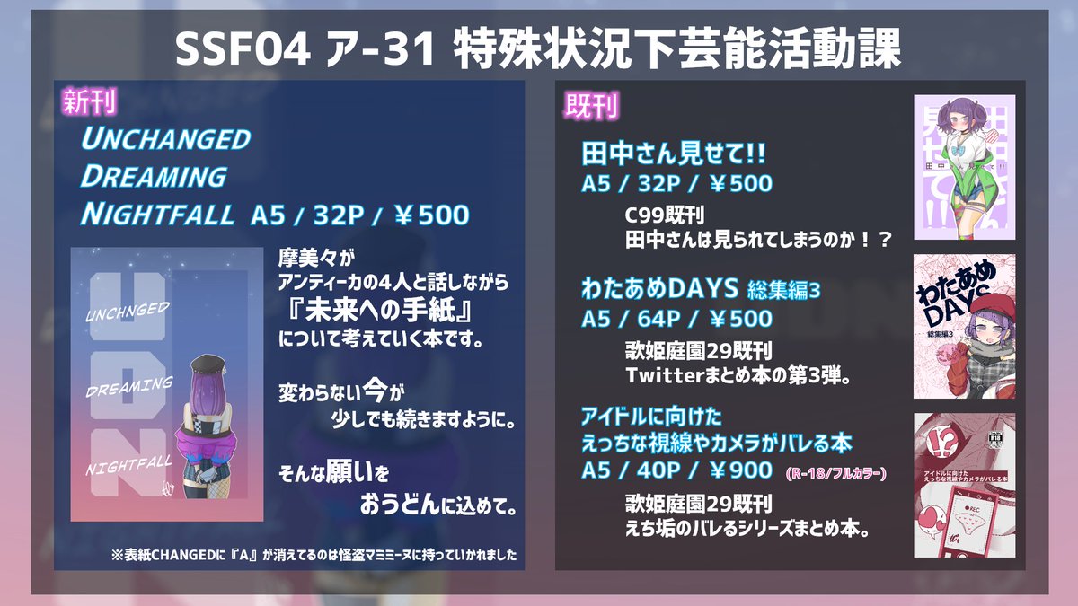 メロンブックスさんでの #SSF04 新刊の委託が始まりました! 命燃やして描いたので、よろしくお願いいたします! 【melonbooks.co.jp/detail/detail.…】 長めのサンプルはツリーで下げます。 (1/6)