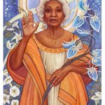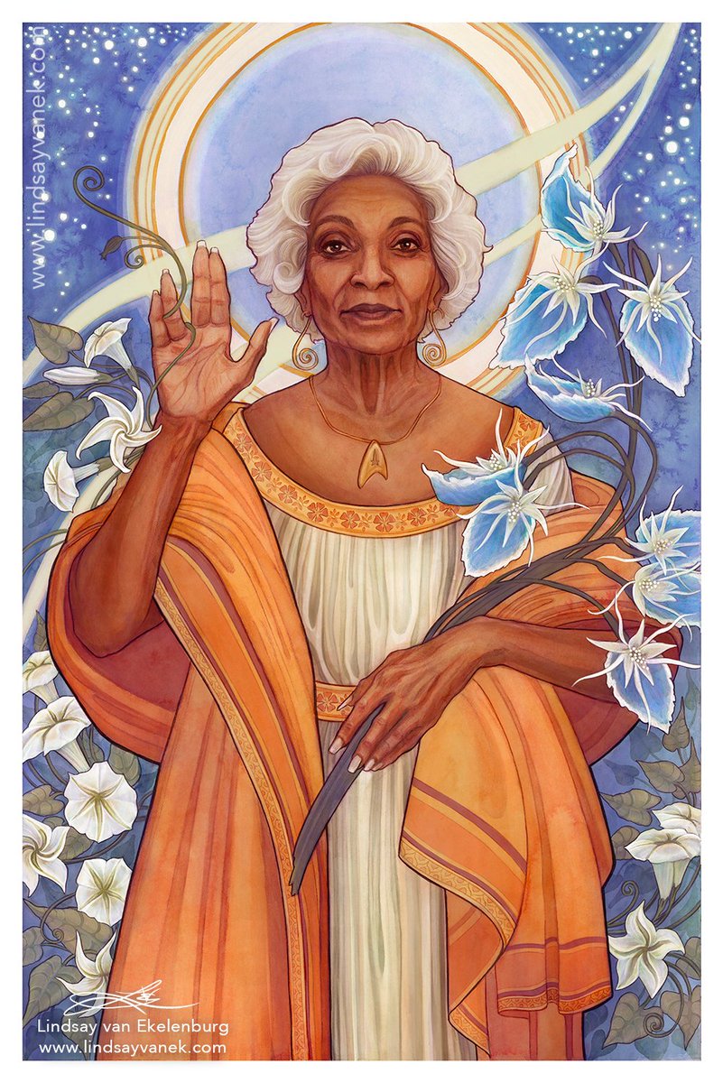 “Our Lady of New Frontiers, Nichelle Nichols” My last painting of 2022, and I wanted it to be a painting carrying me into the new year, a tribute to an amazing and inspirational woman, #startrek's #NichelleNichols