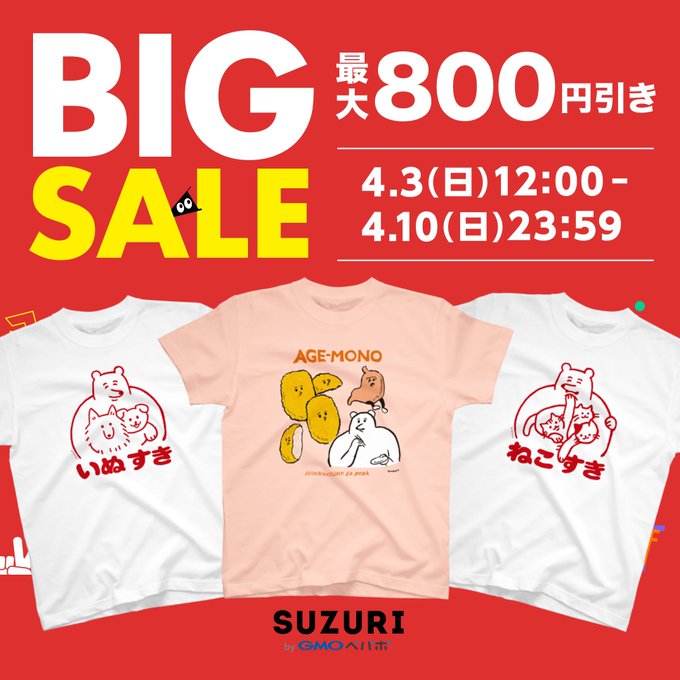 #SUZURIのビッグセール Tシャツなどの16アイテムが 最大800円引きのセール中です👕 [4月10日(日)まで] 「いぬすき」「ねこすき」「AGEMONO」を新たに追加しました。 suzuri.jp/yu_kk_e