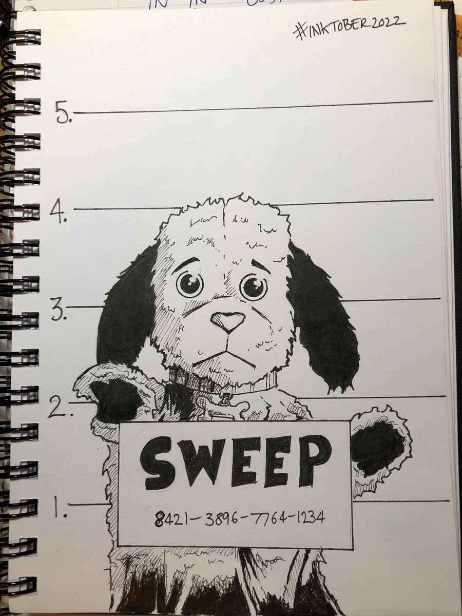 Inktober 2022 Day 21: Bad Dog. Here’s Sweep up to no good, probably. With apologies to @riffraffhands. #inktober2022 #inktober2022day21 #inktober #Sweep