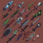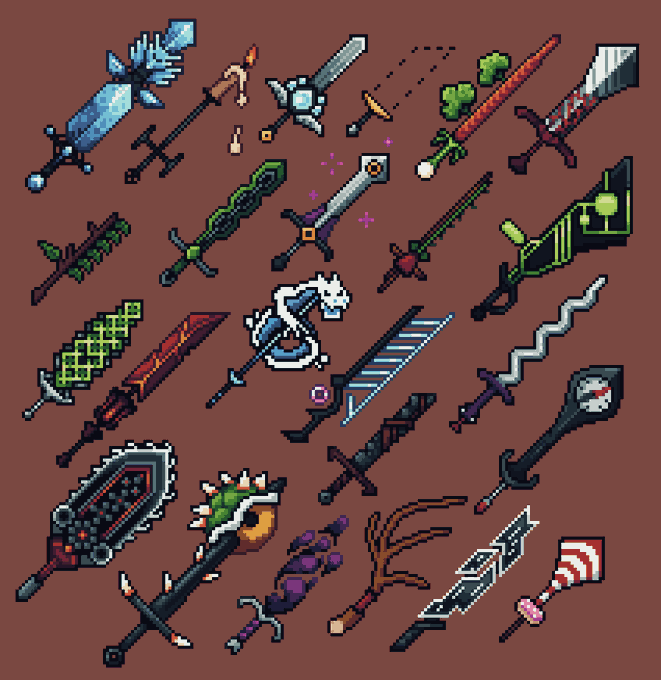 Here's the full collection of all my swordtember swords that I never uploaded... whoops. Also one extra sword at the bottom left which I didn't end up using for the edible theme #pixelart #swordtember