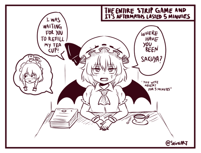 Sakuya Izayoi Strip Game (BONUS ILLUSTRATION) Remilia can't refill a teacup on her own?! feels weird man! #Touhou #東方 #touhouproject #東方Project #十六夜咲夜 #SakuyaIzayoi #CLIPSTUDIOPAINT #fanart #digitalart #illustration